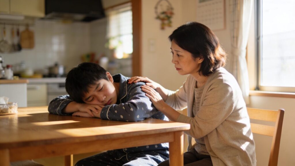 毎朝の声かけは、怒鳴ったり布団をはがしたりするのではなく、カーテンを開けて光を入れ、時間を伝えてあげるだけでOKです。反応がなければまた30分後に、というペースで淡々と続けましょう。お子さんの心に余計な傷をつけないことが、回復の土台を守ることにつながります。
