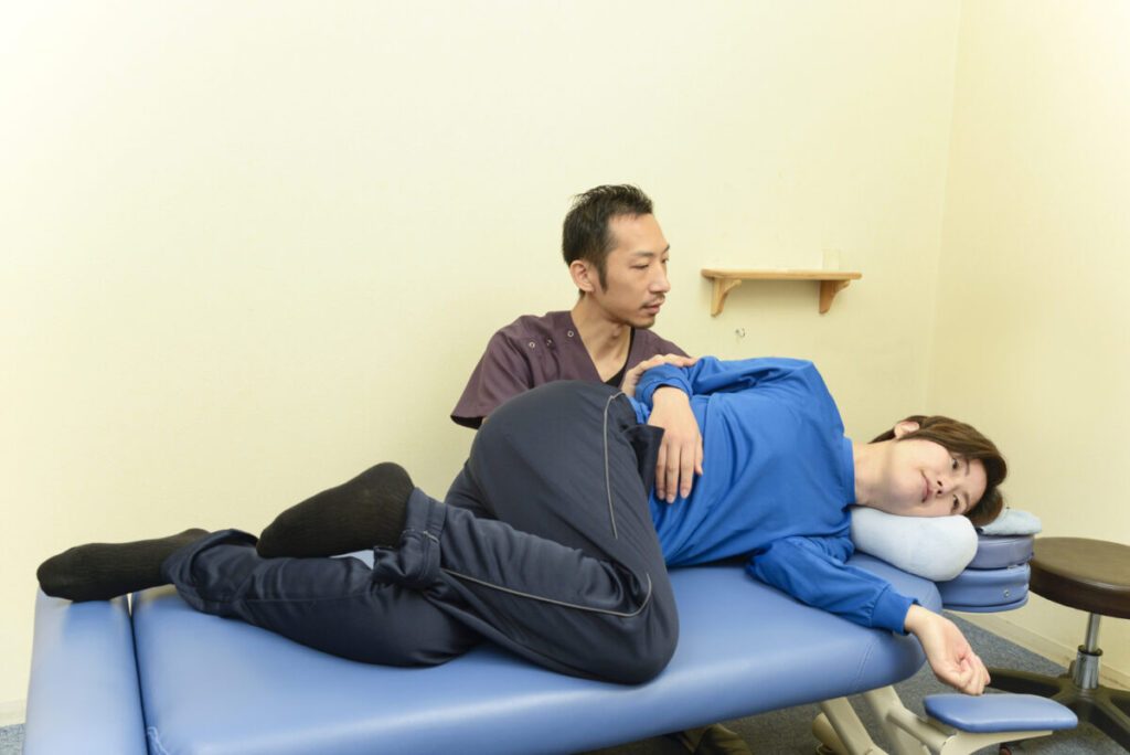 当院では、妊娠中の方への施術経験も豊富にあります。妊婦さんの体に負担をかけない、横向きの姿勢での優しい施術を行っています。お腹を圧迫することなく、骨盤や背骨のバランスを整え、緊張している筋肉を緩めることで、坐骨神経への圧迫を軽減していきます。